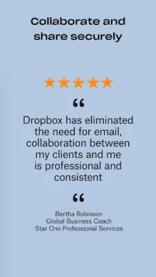 Dropbox is a secure cloud & drive solution leader trusted by Fortune 500 companies for their most sensitive data. Over 14 million paid users choose Dropbox because they know they can count on a company that’s also dedicated to their security and privacy—no matter what they do or where they are. Let Dropbox be your all-in-one file storage, file organizer, file transfer, and file sharing solution for all your devices.