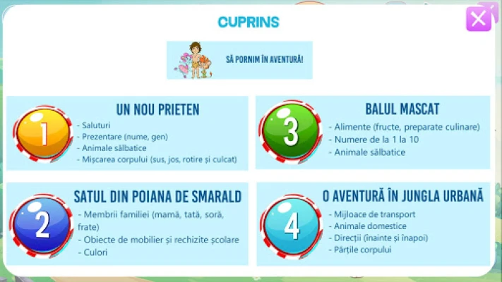 Această aplicație este o versiune DEMO, cuprinzând 4 jocuri edu-distractive și 6 animații educative. Pentru a vizualiza tot conținutul, puteți cumpăra versiunea completă la prețul de 15 lei.