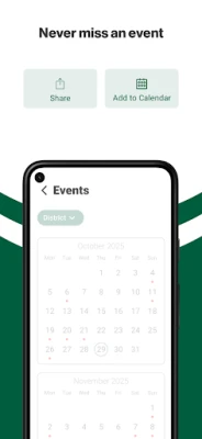 NEVER MISS AN EVENT The event section shows a list of events throughout the district. Users can add an event to your calendar to share the event with friends and family with one tap.
