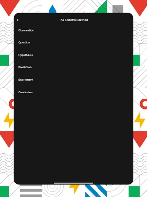 1. Observation 2. Question 3. Hypothesis 4. Prediction 5. Experiment 6. Conclusion