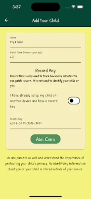 The app provides a timer function to allow the parents to track how much time the child has been patched on a daily basis. It also keeps a historical record of patching times that can be used to help parents stay on track with the minimum recommendations for patching times provided by their children's provider.