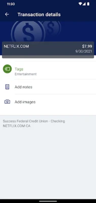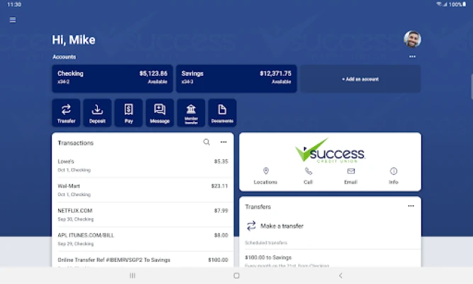 Here’s what you can do with Success CU: Keep your transactions organized by allowing you to add tags, notes and photos of receipts and checks. Set up alerts so you know when your balance drops below a certain amount. Make payments, whether you’re paying a company or a friend. Transfer money between your accounts. Deposit checks in a snap by taking a picture of the front and back. Activate your debit card or turn it off if you’ve misplaced it. View and save your monthly statements. Find branches and ATMs near you.